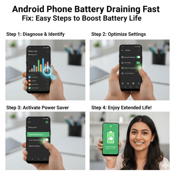 In short, Android Phone Battery Draining Fast Fix starts with stats check and saver mode. Adjust settings and update. If needed, replace the battery. These tips from users and experts help. Your phone will last longer. What fix worked for you?