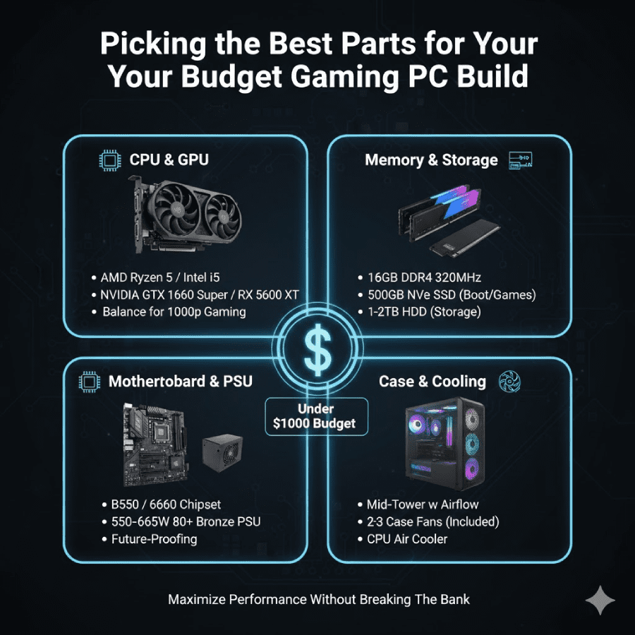 Start with a plan for How To Build A Gaming PC Under $1000 by listing key parts. Focus on CPU first, like the AMD Ryzen 5 7600 at about $185. It has six cores for smooth play and tasks. Pair it with a B650 motherboard for $120, which supports fast RAM and future upgrades. For GPU, grab an AMD RX 9060 XT for around $300, great for 1080p high settings. Add 32GB DDR5 RAM at $90 to run games without lag. Storage? A 1TB NVMe SSD costs $60 and loads fast. Pick a 750W PSU for $80 to keep things safe. Case like Montech AIR at $70 has good airflow. Total stays under $1000 with room for deals. Check sites for sales in January 2026. This setup beats old builds by using new tech like DDR5 for better speed. Community picks from Reddit stress GPU power for games. PCMag guides highlight balance to avoid weak spots. Quora tips warn against cheap PSUs that fail. Go for known brands to stay reliable. Your budget gaming PC build will shine with these choices.