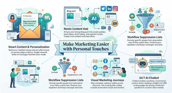 Marketing becomes less tiring when you use the right marketing automation features. Smart content lets one email or page change parts of itself for different visitors. You build it once, and HubSpot shows the right offer based on where someone sits in their journey or what device they use. People respond better because the message feels made just for them. This turns email personalization tools into something truly powerful without extra work.