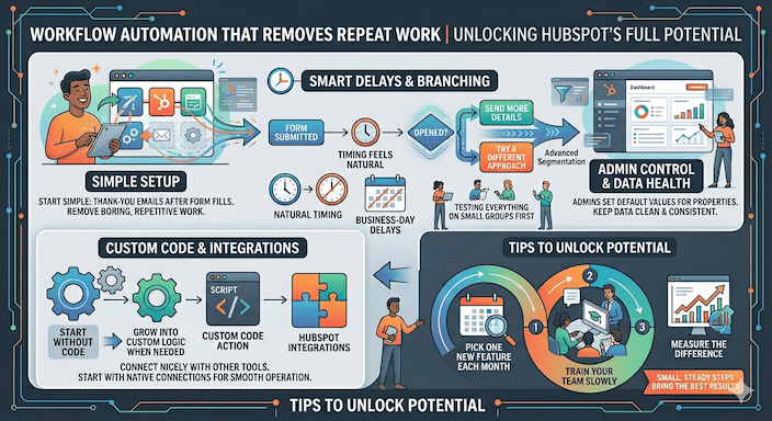 HubSpot workflow automation removes the boring, repetitive work once you set it up. You start simple with thank-you emails after form fills. Then add delays and branches so the timing feels natural. When someone opens a message, you can send more details. If not, try a different approach. Admins can set default values for properties and use business-day delays so nothing sends on weekends. Test everything on small groups first to keep things safe.