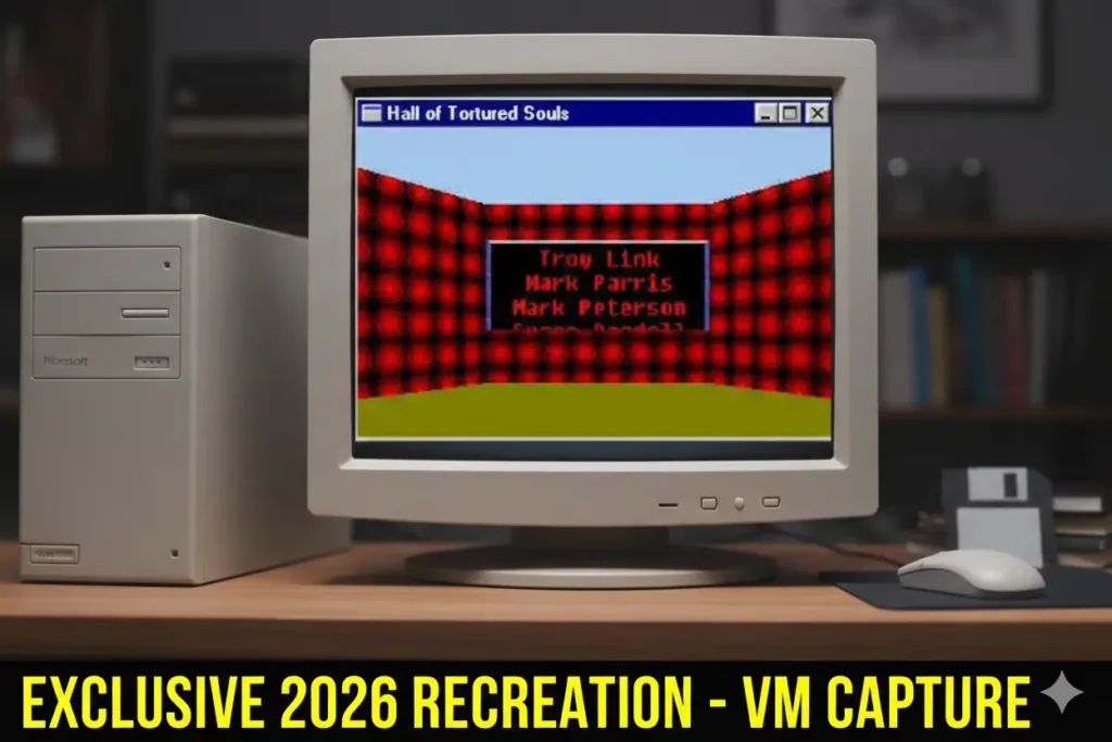 This launched a simple 3D environment called the Hall of Tortured Souls, where users could walk around and see developer credits embedded into textured walls.