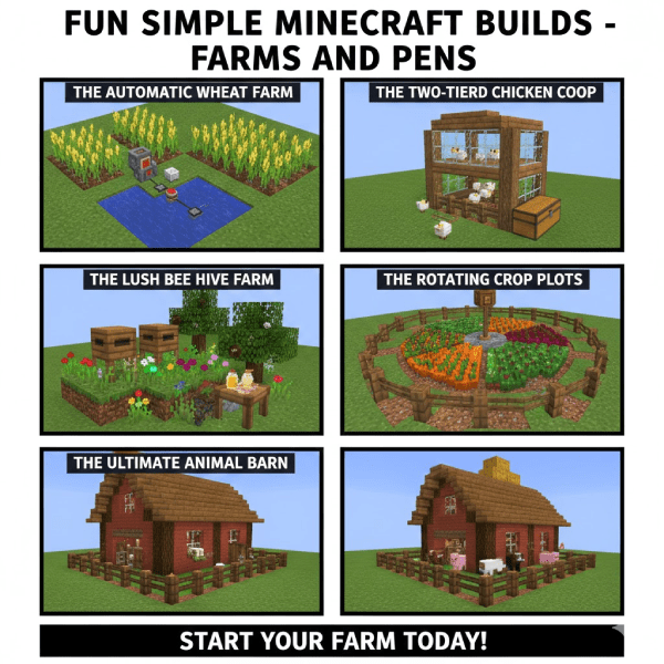 Simple minecraft builds need farms. Minecraft survival base ideas start crop farms. Flat nine by nine. Home dirt. Water center. Seeds plant. Fence round. Gate in. Torch corners. Bone meal grows fast. Skeleton farm near. Compost bin weeds. This easy Minecraft Building Ideas For Beginners survival feeds you. Bread stack. Trade villagers. Wheat gold. Time ten minutes. Dirt free. Bucket water one. Expand auto. Dispenser later. Villager breeder bonus.Animal pen next. Minecraft Building Ideas For Beginners step by step simple. Fence eight by eight. Water trough. Grass inside. Lure cows wheat. Breed love mode. Shear sheep. Milk cows. Egg chickens. Gate trap mobs out. Roof slabs rain proof. Hay bales center. Torch light. Path to house. Wood fences are cheap. Gate iron later. This small minecraft base idea for beginners grows food meat. Leather boots. Infinite supply. Vary pig carrots. Chicken seeds. Fun watch.Minecraft building techniques add style. Raised beds. Cobble borders. Path between. Scarecrow center. Armor stands pumpkin. Flower pots. Bee hives honey. XP farm nearby. Frogs slugs. Compact smart. Beginners win big.Minecraft: How to Make and Design a Minecraft Farm