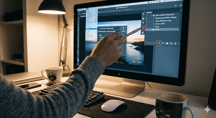 Photoshop actions record your steps. You can replay them with one click to repeat tasks like resizing or exporting images. They are great for batch editing.