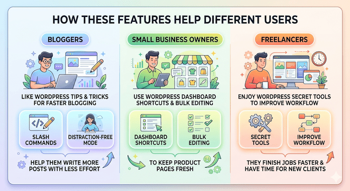 These WordPress lesser known features fix small problems. They cut down on repetitive work. For example, you can update many posts at once instead of one by one. Small business owners like this because it gives them more time for customers. Bloggers enjoy faster writing. Freelancers finish client jobs more quickly.